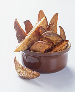 Cut potatoes lengthwise into 1" wedges. Toss with oil and spices in large roasting pan. Roast 20 minutes. Turn wedges and roast until tender and slightly golden, 15-20 minutes more.